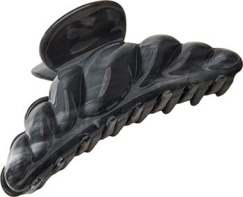 Hair clip for securing hair. This claw clip features a marbled black sesame finish and a sculpted, croissant-inspired shape. It is handmade from cellulose acetate, a plant-based material. The clip's design provides a secure hold for various hairstyles, from updos to half-up styles. Its smooth finish and substantial feel indicate quality construction. The unique marbled pattern ensures each clip has a distinct appearance. Handmade from cellulose acetate, a durable plant-based material. Sculpted, croissant-inspired design adds visual interest. Secure grip suitable for medium to thick hair types. Measures approximately 4 inches in length.