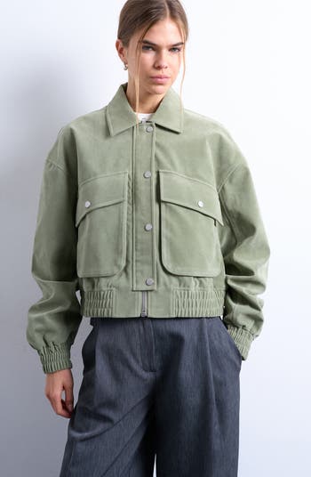 Put the perfect finishing layer on your streetwear looks with this boxy bomber-inspired jacket cut from a sturdy flocked fabric.