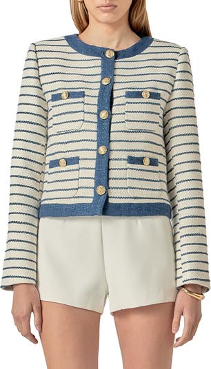 Gilded etched buttons elevate this textured bouclé jacket made in a polished cropped silhouette.