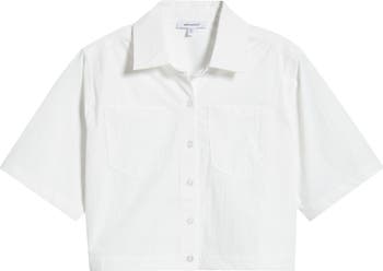 Refresh your everyday style uniform with this crisp button-front shirt in a perfectly cropped length.