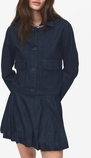 A cropped length and nonstretch denim in a dark wash make this jacket a versatile addition to your everyday style portfolio.