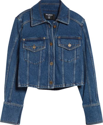 Classic trucker details shape this cropped denim jacket fastened with brass logo buttons and washed to a gentle worn-in fade.
