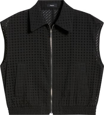 Allover eyelet embroidery makes this slightly cropped vest an incredibly breathable layer for warmer weather.