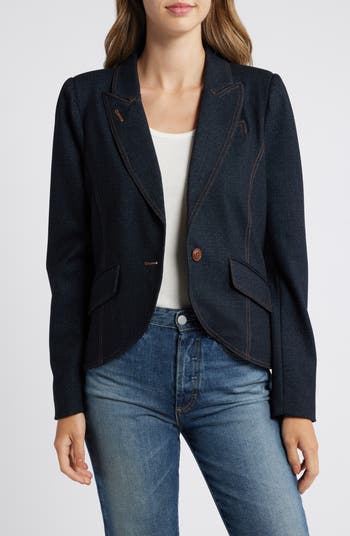 A denim-inspired knit puts a casual twist on a military-inspired blazer made with sharp angles, contrast stitching and slightly puffed shoulders.