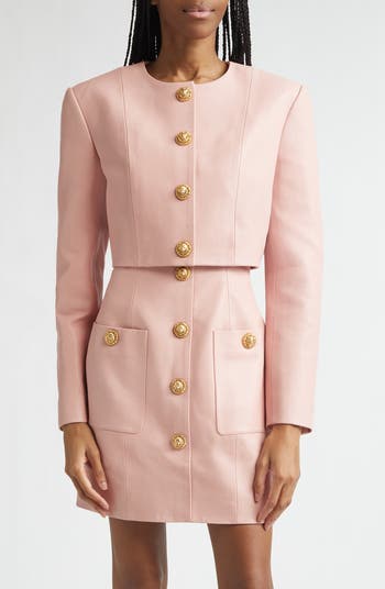 The classic Balmain cut and accoutrement authenticate this crop jacket tailored from supple lambskin leather in a powder-pink hue.