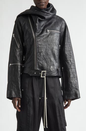 Crafted in Italy from natural grained leather, this asymmetric zip jacket with a high funnel neck is slashed with multiple zip pockets at all angles and a buckled belt strung through edgy studded beltloops.