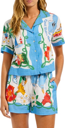 A notched collar and vacay-inspired print lend laid-back energy to this linen-blend cover-up shirt that's lightweight and breezy.