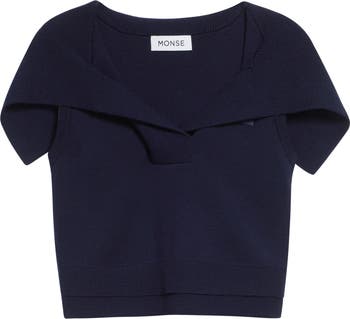 An exaggerated sailor collar frames the shoulders of this cap-sleeve sweater knit from extrafine merino wool and finished with a doubled rib hem.