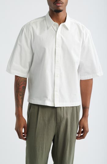 A cropped hem emphasizes the boxy, relaxed fit of a shirt cut from cool cotton poplin and topped with a pointed collar to keep you looking smart even when you don't have to. Wear it on its own or layered and unbuttoned depending on the day, the occasion or your mood.