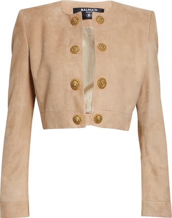 This cropped Spencer jacket inspired by Regency-era styles is crafted from buttery suede and edged at the placket and cuffs with golden etched lion's-head buttons to illuminate the otherwise minimalist design.