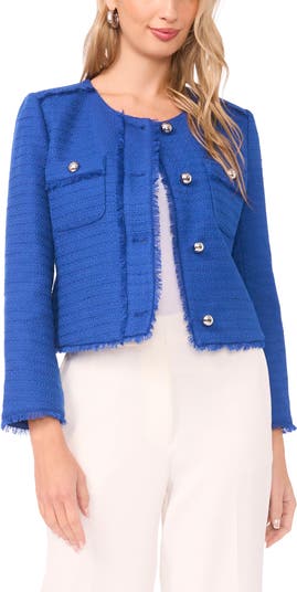 Flickered in fringe and closed with gleaming buttons, this tweedy jacket is ready to add a pop of color to both work and weekend looks.