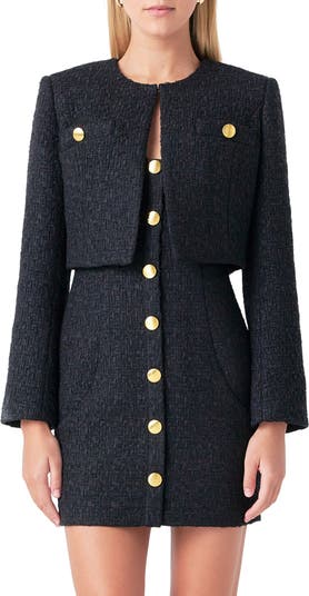 Clean lines and a collarless silhouette define an tweedy jacket accented with brassy buttons and cut to a waist-skimming length. Wear it to complete a workday look or elevate a weekend 'fit.