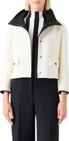 This cropped jacket captures the label's architectural elegance in a clean, structured silhouette crafted from virgin-wool twill with pops of contrast at the collar, placket and buttons.