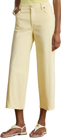 Wide ankle-grazing hems and comfortable stretch enhance the relaxed fit of these high-waist jeans in a faded yellow wash.