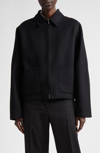 A cropped, dolman-sleeve cut from wool-and-cashmere double face brings a rounded, almost-cocoon silhouette to this sleek, simplified bomber jacket.