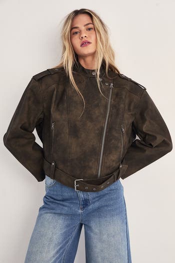 Make a bold statement with this contemporary cropped faux leather biker jacket from NastyGal. The modern silhouette offers versatility for day-to-night styling, perfect for those seeking an effortless transition from casual to evening wear.