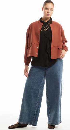 A chic update to your quintessential bomber, this cropped bomber jacket comes finished with ribbed cuffs and snap closures. Its flap pockets and relaxed fit balance utility edge and modern ease. Women's plus-size bomber jacket. STYLE NOTES Slightly relaxed fit Crew neck Dropped shoulder Fully lined Snap closures Front flap pockets 25" length FABRIC & CARE 64% Polyester, 34% Rayon, 2% Spandex Machine wash gentle