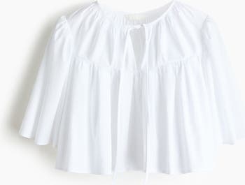 Cropped, oversized blouse in a cotton weave featuring a round neckline with gathers all around and a V-shaped opening with narrow ties at the front. Gathered yoke at the front and back, and short puff sleeves.