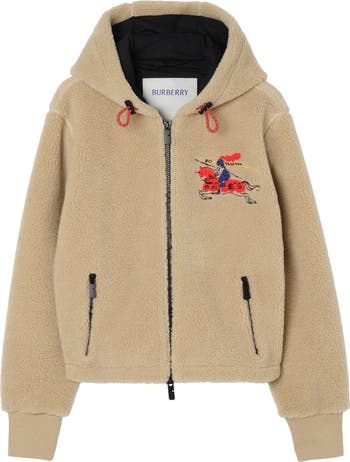 A hooded jacket in a soft wool cashmere blend fleece, embroidered with our Equestrian Knight Design. Created as part of our Year of the Horse capsule, the artwork playfully reimagines our house code in textural and metallic threads. The style is lined with lightweight mesh and is cut to a regular fit with a cropped length.||Two-way zip closure|Side zip pockets|Drawcord hood|Rib-knit cuffs|Embroidered Equestrian Knight Design at chest and back