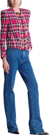 Cropped jacket in glitter plaid tweed Round neck Double-breasted 'Lion Head' button fastening Long sleeves Straight cuffs with 5 gold metal 'Lion Head' buttons Straight cut Model measures 180cm and wears a size 36 Main material: 47% cotton 23% merino wool 11% polyamide 10% cotton 8% polyester 1% other Made in Poland Item: GF1SM509CG42