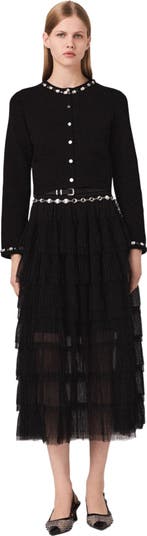 This season, bold black pieces and precious accessories enhance every silhouette, for a look that is radiant, intense and refined. This cropped knit cardigan stands out with its rhinestone-decorated collar and cuffs, adding a luminous touch to the silhouette. Its braided trim and jewel buttons reinforce its elegant and sophisticated look.Pair with the matching dress for a sophisticated total look, or wear on its own with high-waisted jeans for a chic, modern contrast.