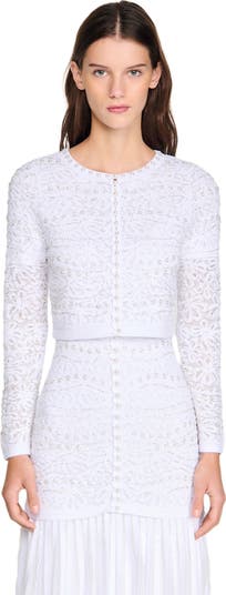 Cropped textured knit cardigan embroidered with pearls, with a round neck, long sleeves and a front button fastening.