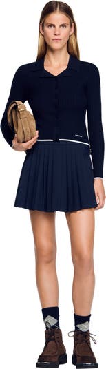 Cropped polo collar cardigan with button fastening, long sleeves, and embellished with a contrasting band and SANDRO embroidery on the hem.