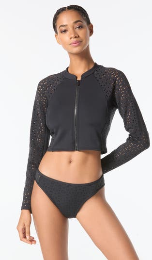 Wear this over your swimsuit or on its own on your next adventure. A cropped fit shows off your midsection. The zipper front neckline provides coverage adjustability when you need it. A laser cut scuba knit fabric is ultra chic but provides all day comfort.