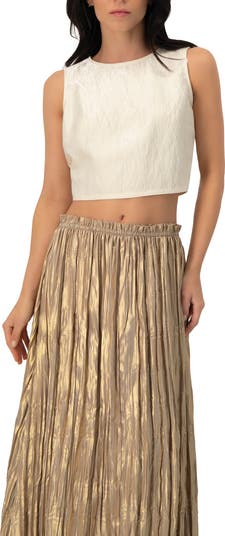Minimalist cropped top in structured ivory fabric with a sleek silhouette and exposed gold zipper at the back