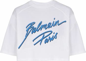 T-shirt with flocked Balmain Letter logo Round neck with ribbed trim Short sleeves Contrasting flocked Balmain Letter logo on the front Cropped, relaxed fit Model measures 179cm and wears a size S Main material: 100% cotton Made in Portugal Item: EF1EE080BC97