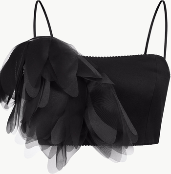 This cropped top features delicate spaghetti straps and oversized layered floral appliques for bold texture across a pared-back silhouette. The shorter cut makes it easy to pair with high-rise skirts or pants, while the slim straps keep the focus on the dimensional florals. It is an easy way to add statement detail to evening styling. The layered appliques give it a feminine finish that reads polished rather than sweet.