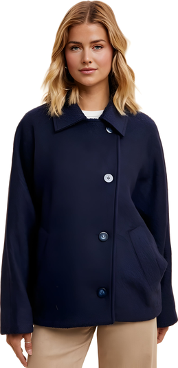 - cropped navy coat delivers a balance of warmth, structure, and versatility with its clean lines, wool-blend texture, and deep tone—perfectly tailored for elevated everyday dressing.