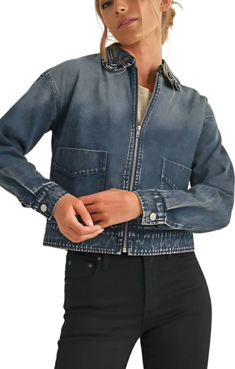 - Washed denim jacket with zip closure, flap pockets, and a modern cropped silhouette