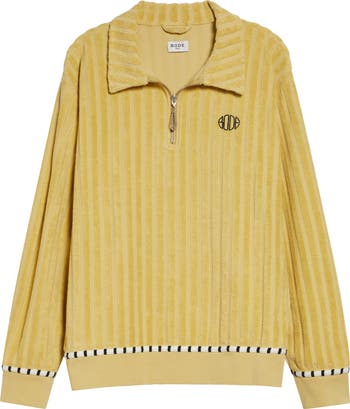 Inspired by nostalgia for iconic '70s styles, this wide-rib terry-cloth pullover brings plush texture to your wardrobe. Croquet-striped trim edges the hem and cuffs, while a unique beaded ball-chain puller accents the metal zipper for a special touch.