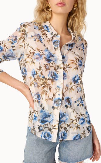 A burnout floral pattern add vivid color and texture to this gauzy chiffon shirt that buttons up the front.