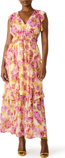 Floaty ruffles add fluttering movement to this enchanting maxi romanced by a vivid floral print and made with waistline smocking to shape the silhouette.