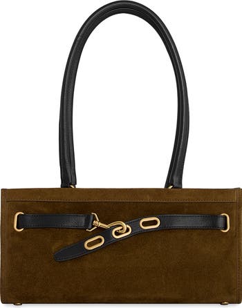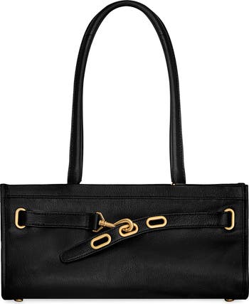 A gleaming lobster clasp and oval grommets punctuate a supple leather crossbody bag framed by a pair of elongated shoulder straps and a protective base.