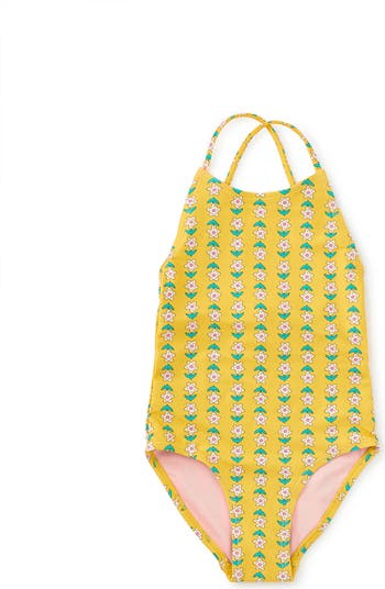 Designed for sunny days and confident water play, this Cross Back One-Piece Swimsuit blends a sleek silhouette with thoughtful, kid-friendly details. Featuring an artist-designed print created in-house, it brings a bright, expressive feel to a modern swim essential. Thoughtfully made with UPF 50+ sun protection and crafted from recycled materials, it's built to last swim after swim.A fitted shape with a low back and adjustable shoulder ties allows for a customizable, comfortable fit that moves easily in and out of the water. Fully lined for coverage and comfort, this style also includes removable padded inserts in sizes 12-16 for added versatility as kids grow. Be sure to follow our care instructions to help keep it looking its best all season long.