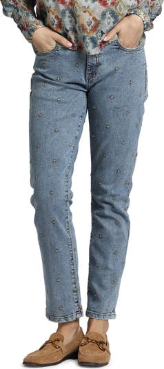 It's X marks the spot when you land on these stretchy, slim-yet-slouchy jeans embroidered with allover crosses.