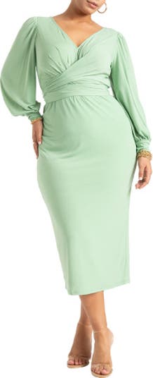 A lined skirt midi dress with a front twist and self-ties, offering a column skirt silhouette and long sleeves, made from stretch matte jersey knit.