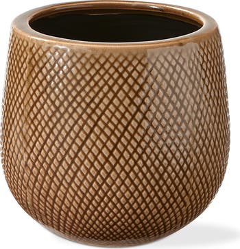Inspired by the sweet touch of the warm sun, this textural cross hatch planter brings a vibrant and natural vibe to interior decor. Showcasing stoneware construction, shiny glaze with exposed clay bottom, this decorative planter gives your household foliage a beautiful upgrade. Features include a drainage hole with silicone plug. Fits up to a 4" drop in pot.