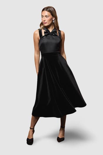 Cross Neck Bow Velvet Midi Dress