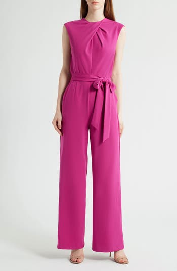 Slight sleeves and wide hems enhance the sophisticated silhouette of this vivid jumpsuit designed with a twisted neckline for textural interest and a tie belt for shape. It's made from stretchy scuba-crepe fabric for structure and recovery.