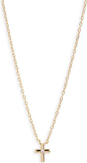 A gleaming crystal catches the light in the center of this radiant cross pendant necklace plated in 18-karat gold.