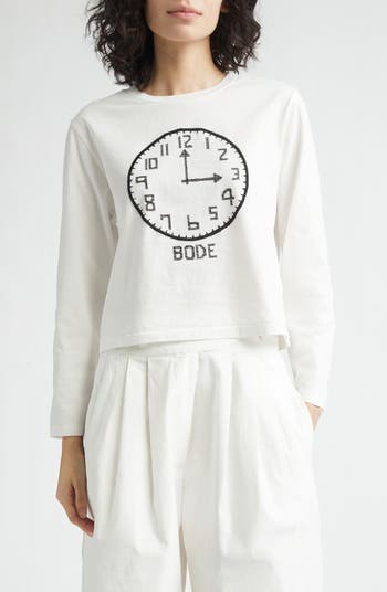 From Bode's tribute to American composer Morris 'Moose' Charlap comes this semisheer cotton T-shirt with an embroidered, cross-stitched clock inspired by the 1954 Broadway musical 'Peter Pan'—a production Charlap helped shape as a principal composer.