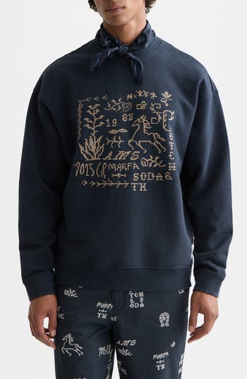 Add some artistic flair to your everyday look in this relaxed-fit sweatshirt highlighted by eye-catching cross-stitch artwork.