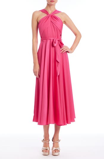 A twisted crossover neck shapes the fitted bodice of this silky night-out dress designed with a flowy full skirt and cinched with a drapey sash at the waist.