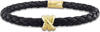Crossover Motif Black Leather Cord Bracelet 14k