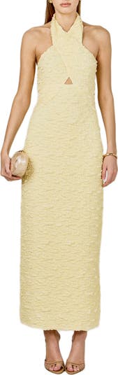 Textured fabric with just the right amount of stretch adds a luxe, modern feel to this streamlined halter dress.