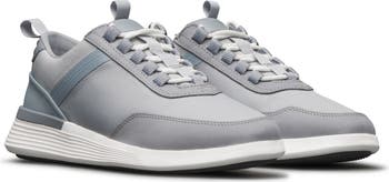 Durable leather overlays highlight the sporty mesh upper on an active sneaker designed with memory foam cushioning and a high-abrasion rubber sole for premium comfort and stability.